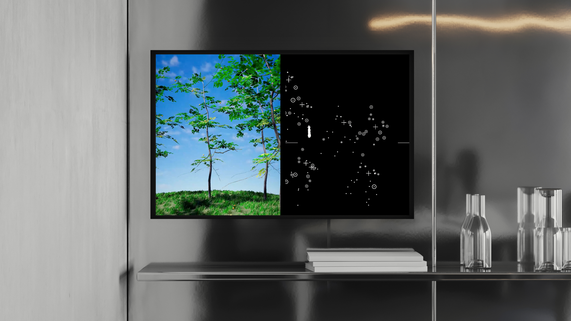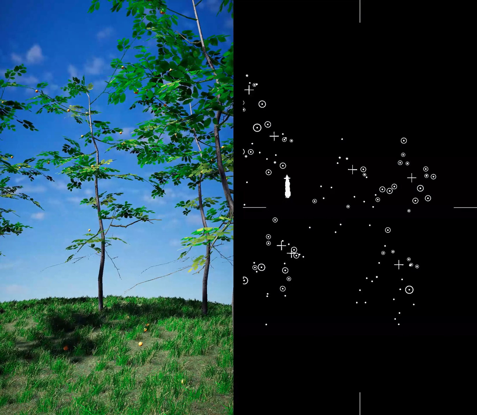 "N.Loop V2" is an evocative art installation that captures the subtle yet transformative role of deer in forest regeneration. This micro-simulation demonstrates how deer, through their natural behaviors of eating fruit and subsequent defecation, contribute to the germination of new trees and the expansion of the forest. The installation offers a diagrammatic visualization of this ecological process, highlighting the integral connections and dependencies within forest ecosystems. Through a meticulous portrayal reminiscent of a natural symphony orchestrated with the precision of an environmental conductor, "N.Loop V2" invites viewers to consider the nuanced interactions that foster growth and sustainability in nature.